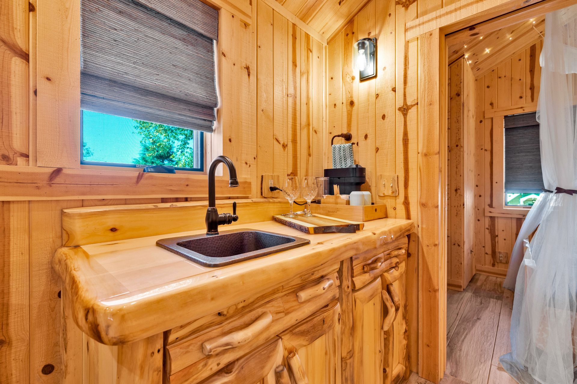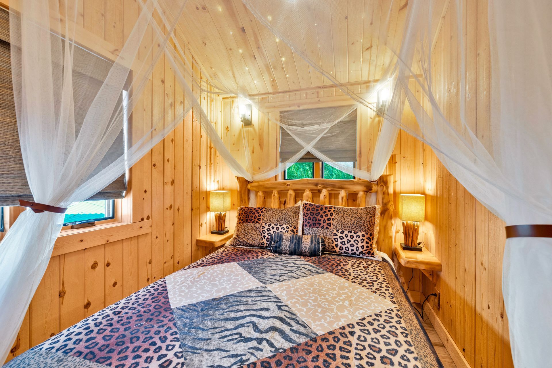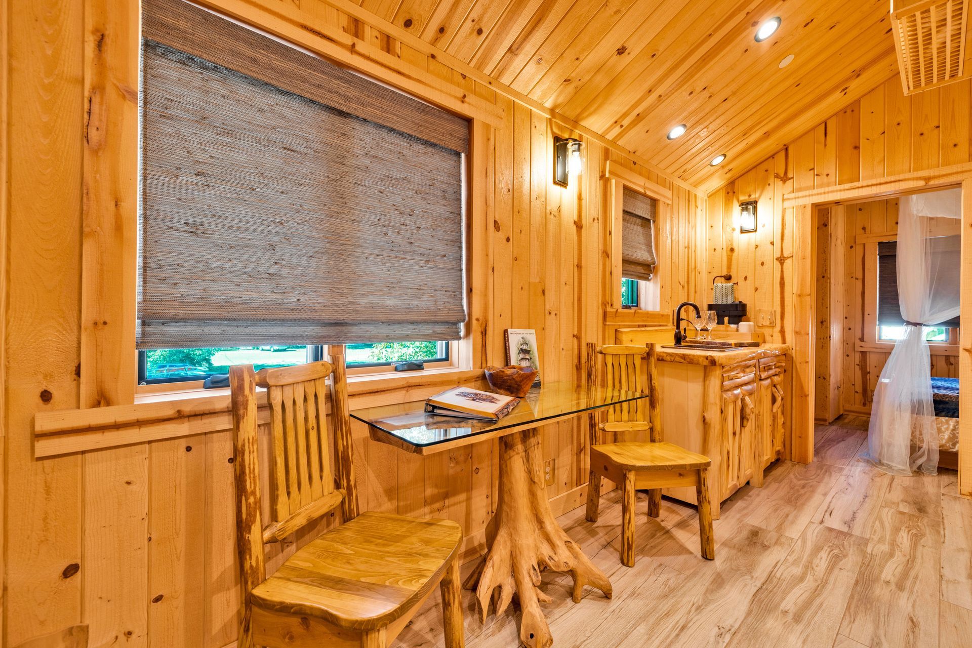 Welcome to the Treehouse, a luxurious haven nestled among the branches where rustic charm meets modern comfort. Perched atop a majestic tree, this enchanting escape offers a private bedroom with a canopy bed, cozy leather loveseat, and a cut log wet bar. The hidden bathroom boasts wood tile and a charming cut log vanity. Step outside onto the deck to find an outdoor cedar tub, inviting you to soak under the stars. Surrender to the magic of nature in this unique sanctuary.