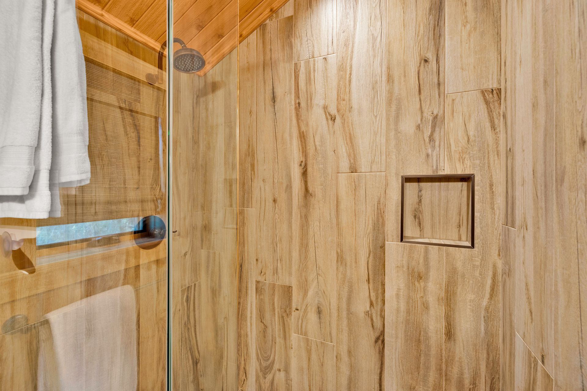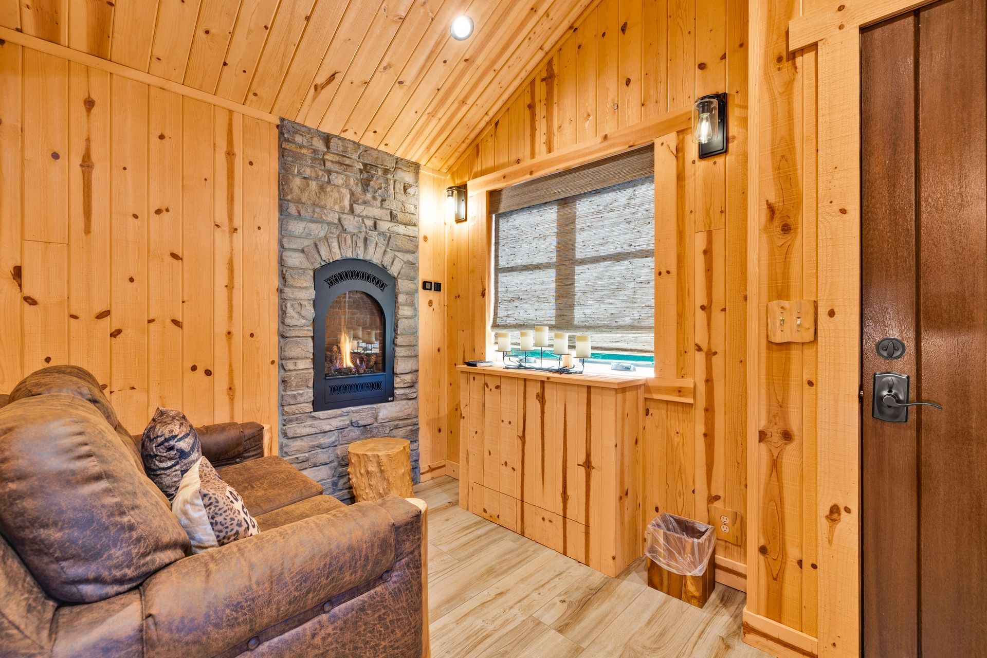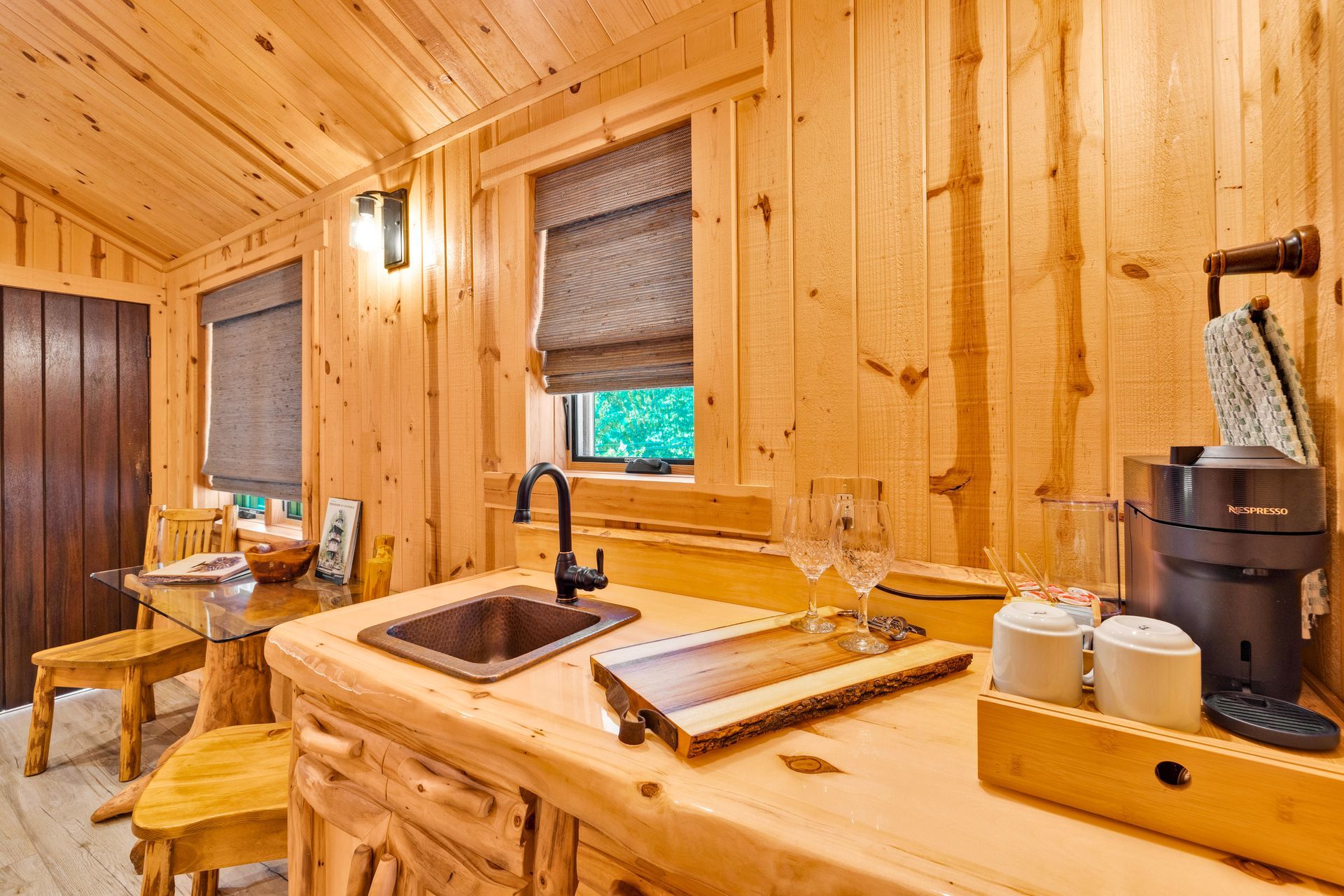 Welcome to the Treehouse, a luxurious haven nestled among the branches where rustic charm meets modern comfort. Perched atop a majestic tree, this enchanting escape offers a private bedroom with a canopy bed, cozy leather loveseat, and a cut log wet bar. The hidden bathroom boasts wood tile and a charming cut log vanity. Step outside onto the deck to find an outdoor cedar tub, inviting you to soak under the stars. Surrender to the magic of nature in this unique sanctuary.